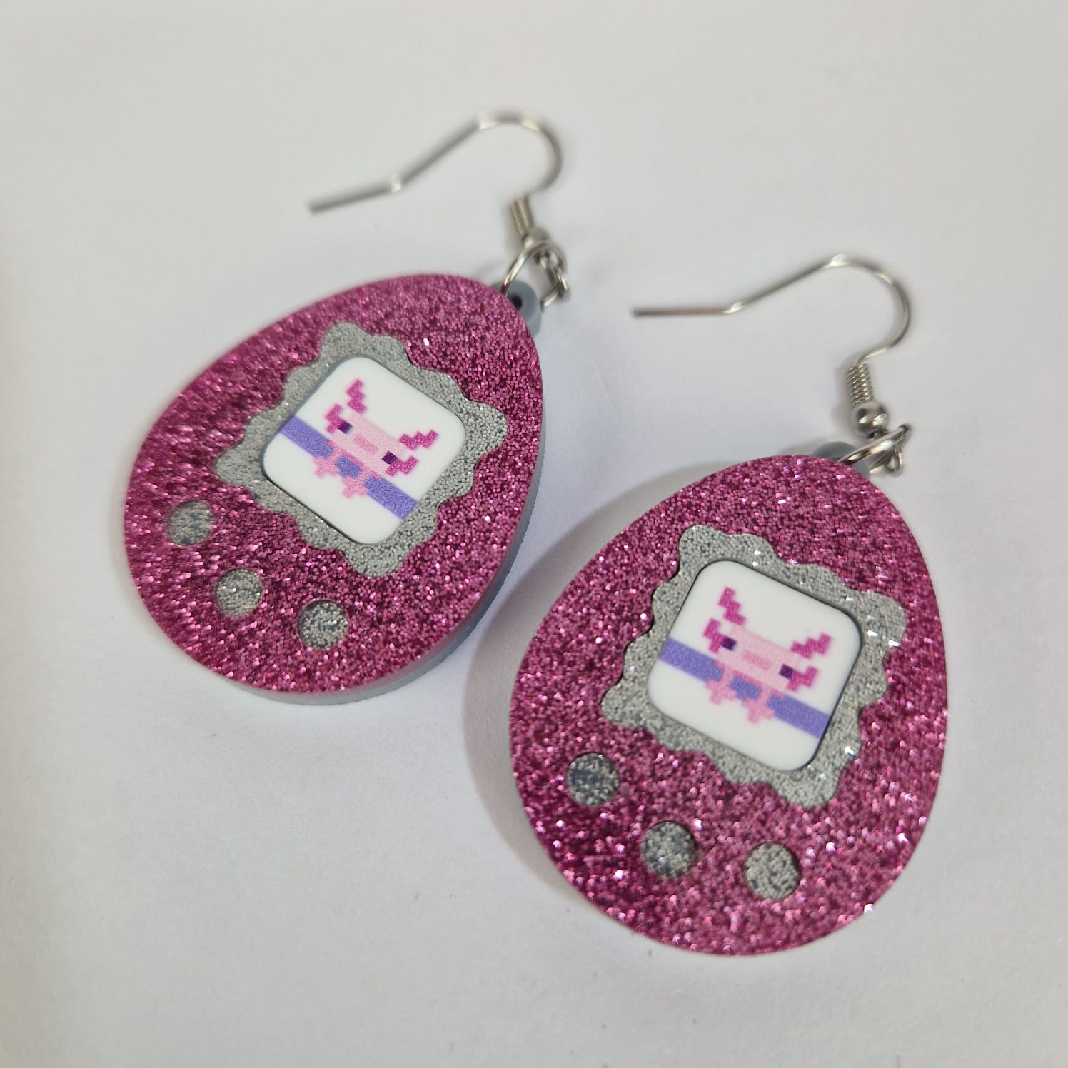 Bring back the joy of the 90s with our Tamagotchi Retro Pet Earrings, a nostalgia-packed bestselling range designed for customers who love playful fashion, statement jewellery, and anything that sparks childhood memories. Each pair features a cute pixel-pet screen, glitter-layered body, and classic “three-button” detailing .